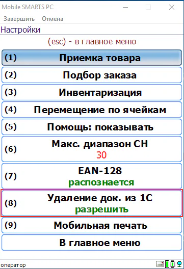 Иногда товары с серийными номерами поступают в больших коробках, на которых налеплено много этикеток (по одной на каждый вложенный экземпляр товара). Есть возможность сканировать не каждую отдельную этикетку с серийными номерами, а только с первую и последнюю. Если серийные номера идут подряд (а обычно это так), то программа сама понимает, сколько там серийных номеров и заводит их диапазоном сразу. Иногда серийные номера идут не по порядку, и тогда между первым и последним окажутся тысячи промежуточных серийных номеров. Чтобы отлавливать такие случаи, в программе стояло ограничение, что между первым и последним должно помещаться не более 30 номеров. Это ограничение можно было поменять только в конфигурации, а теперь оно вынесено в настройки прямо на ТСД.