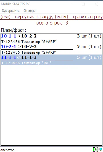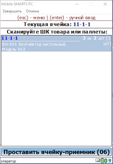 Переработана операция «Перемещение» — появилась возможность перемещать между ячейками наборы из нескольких товаров (группой). Так же появилась возможность собирать товар «на палету», для дальнейшего размещения её в финальной ячейке.