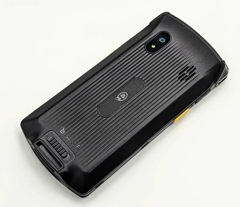 На задней поверхности устройства расположены фотокамера (13 Мп) и звуковой динамик. У батарейного отсека нет отдельной крышки, так как она цельная и снимается со всей задней поверхности целиком. Поверхность крышки текстурированная, поэтому удержать ТСД в руке проще, чем, например, Urovo CT48. С обратной её стороны расположен NFC-модуль для чтения карт со встроенным чипом.