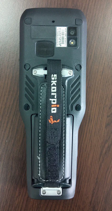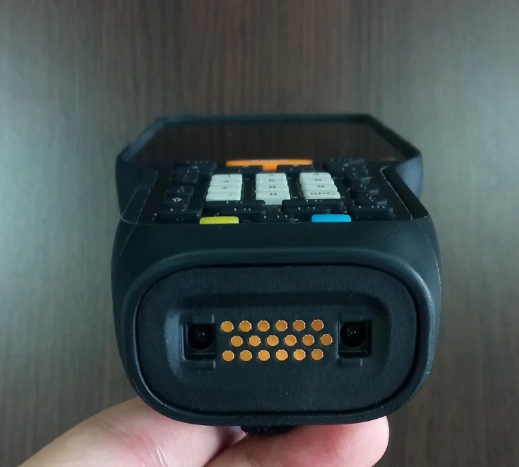 Так как устройство достаточно массивное, на нем предусмотрены два варианта креплений: для наладонного ремешка или для пистолетной рукоятки — можно выбрать, что вам больше по душе или по бюджету. На задней стенке ТСД находится кнопка сканирования, которая нажимается в процессе работы с пистолетной рукояткой.