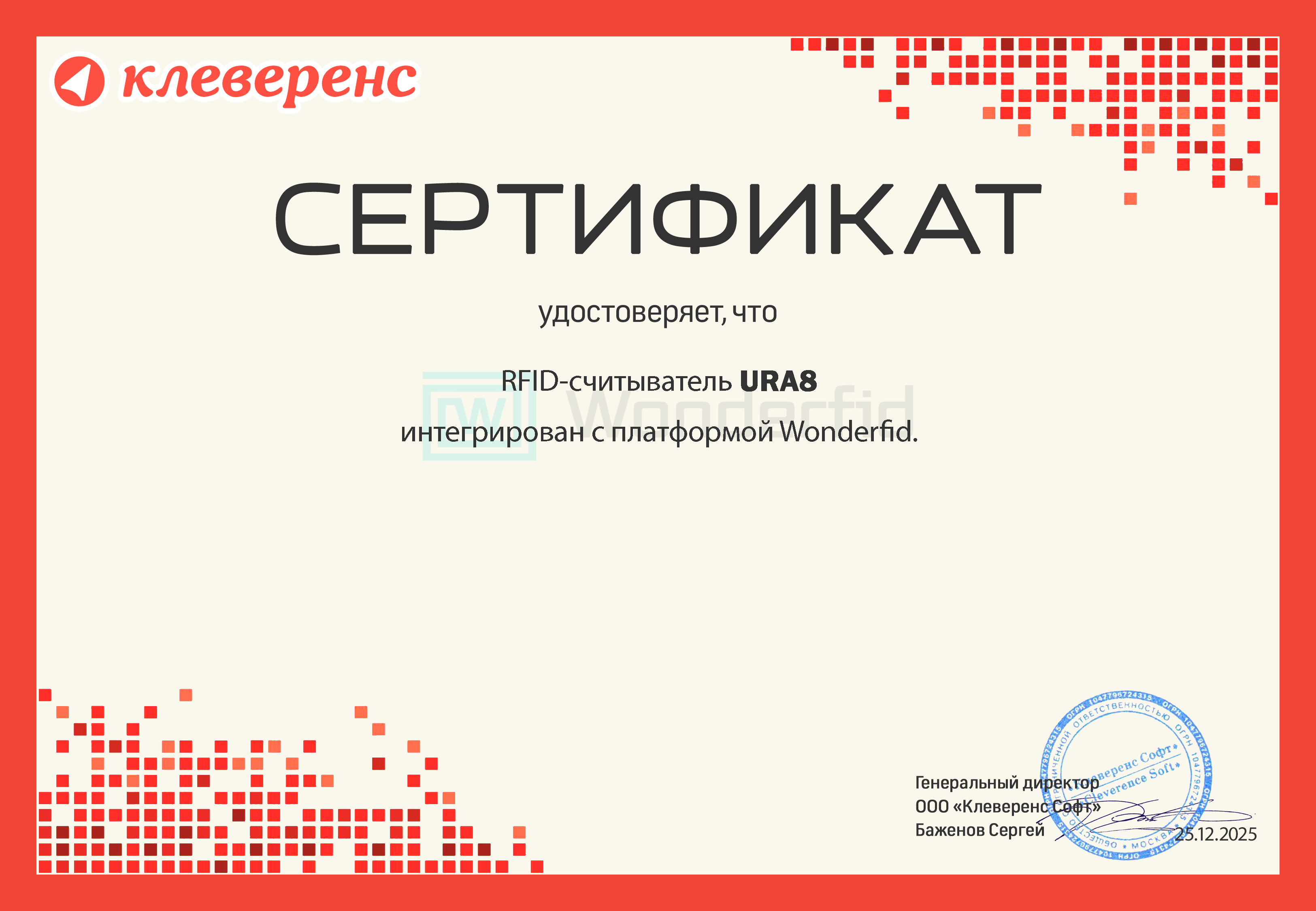 Завершена интеграция стационарного RFID-считывателя Chainway URA8 с софтом «Клеверенс». Chainway URA8 — это стационарный RFID-считыватель промышленного класса, который устанавливается на воротах, в проёмах или над конвейером. Паллета с товарами проезжает мимо — за долю секунды все RFID-метки на ней считываются автоматически. Система моментально проверяет комплектность, сверяет с накладной, фиксирует движение товаров. Никаких ручных операций, никаких остановок, всё автоматически. |
